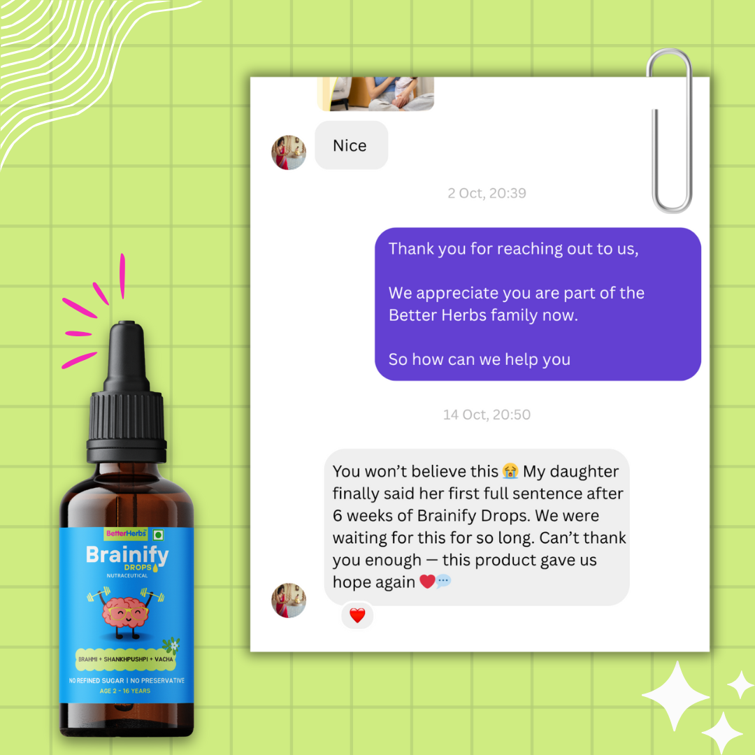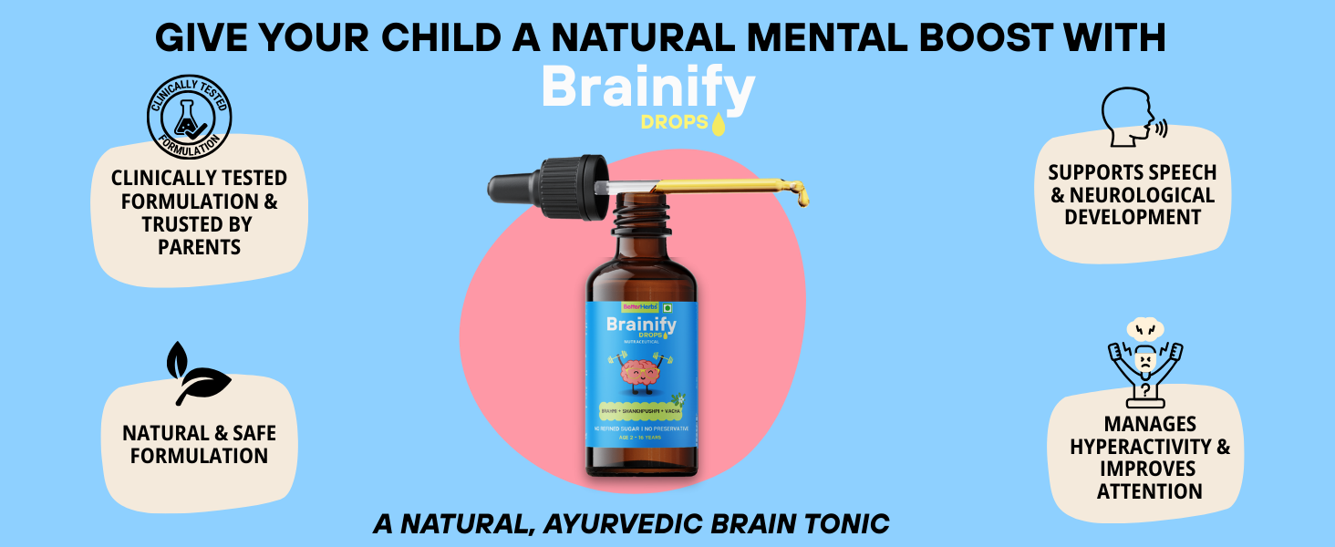 Brainify Drops is a clinically tested formulation, FSSAI-certified Ayurvedic nutraceutical product formulated for children aged 2–16 years to support speech delay, hyperactivity, focus, memory and healthy brain development.
