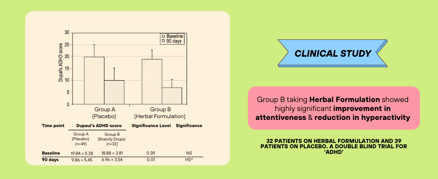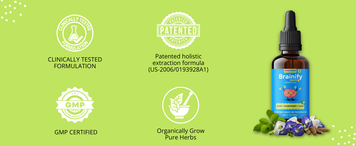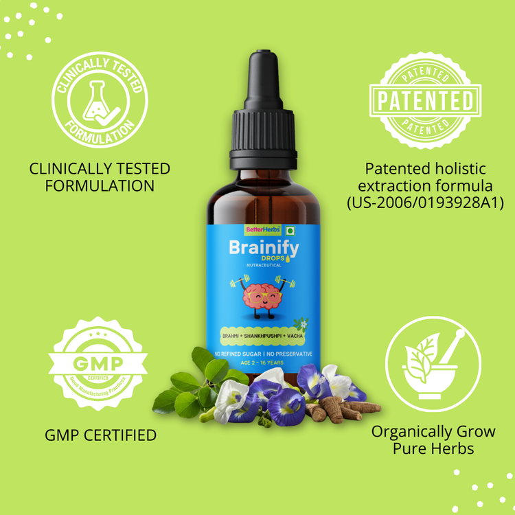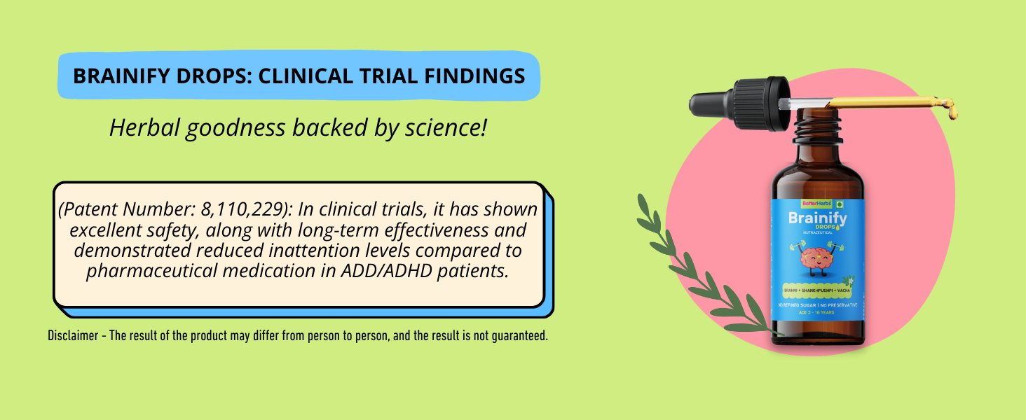 Brainify Drops has herbal formulation that is clinically tested (double-blind trials referenced in product documentation) with reported improvements in attentiveness, reduction in hyperactivity and measurable IQ/memory gains in trial participants.