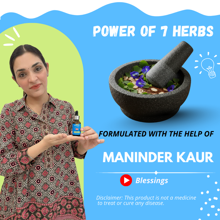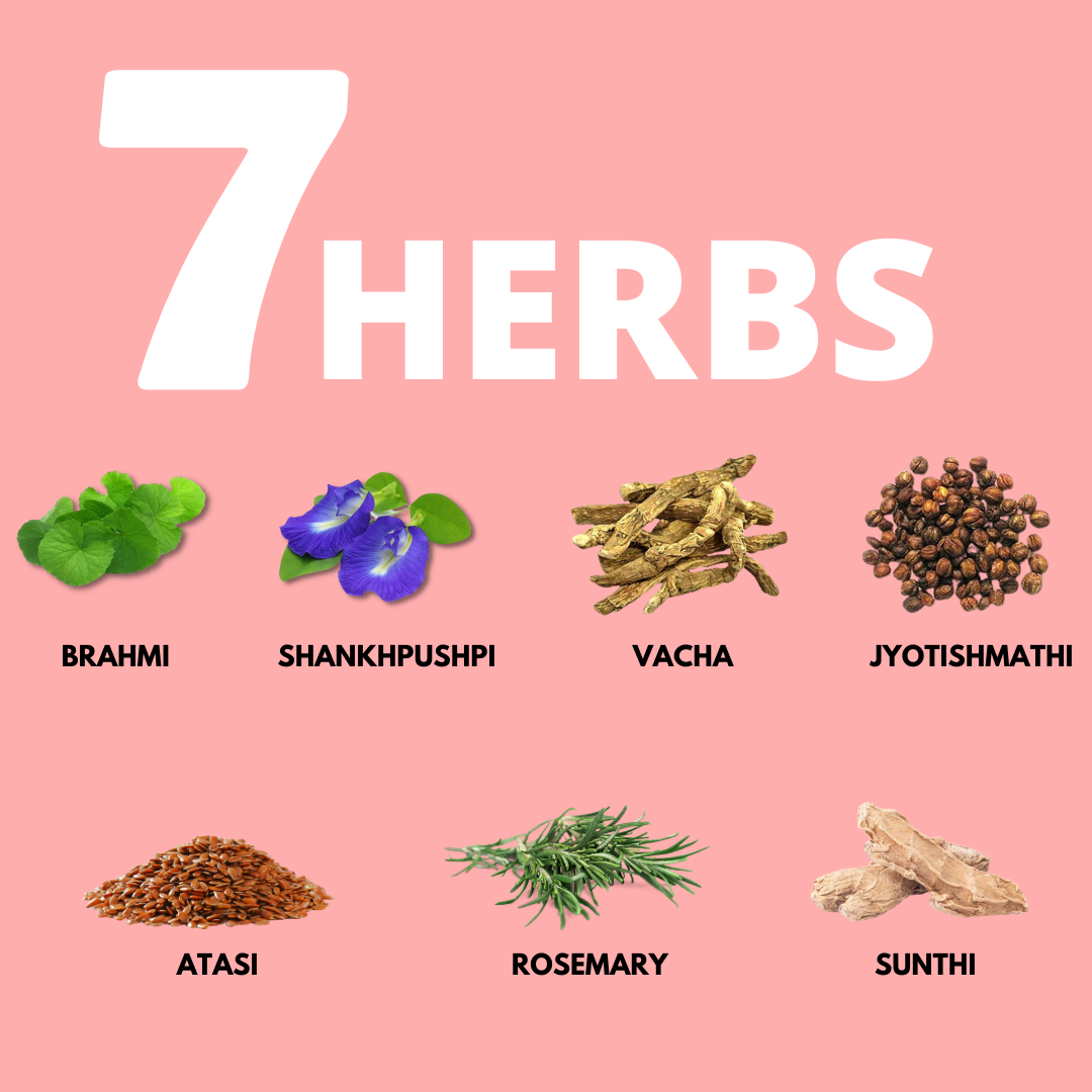A researched 7-herb blend: Brahmi, Jyotishmati, Shankhpushpi, Vacha, Sunthi, Rosemary, Atasi (flaxseed), delivered in MCT oil and naturally sweetened with monk fruit.