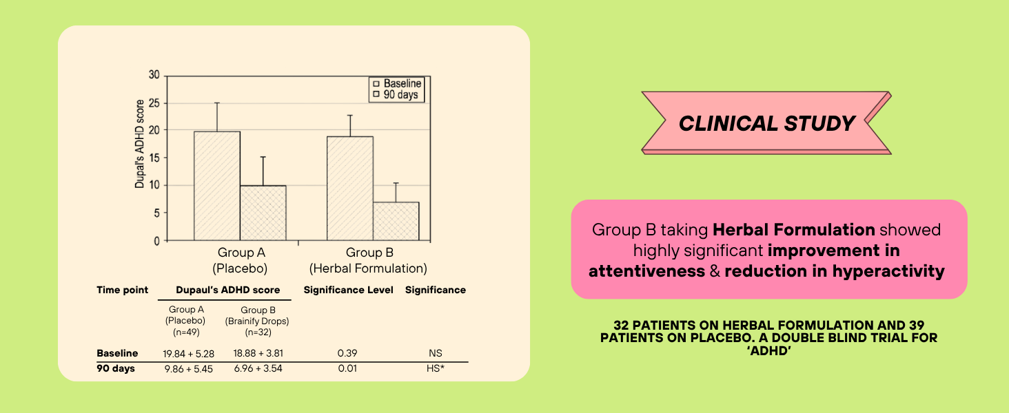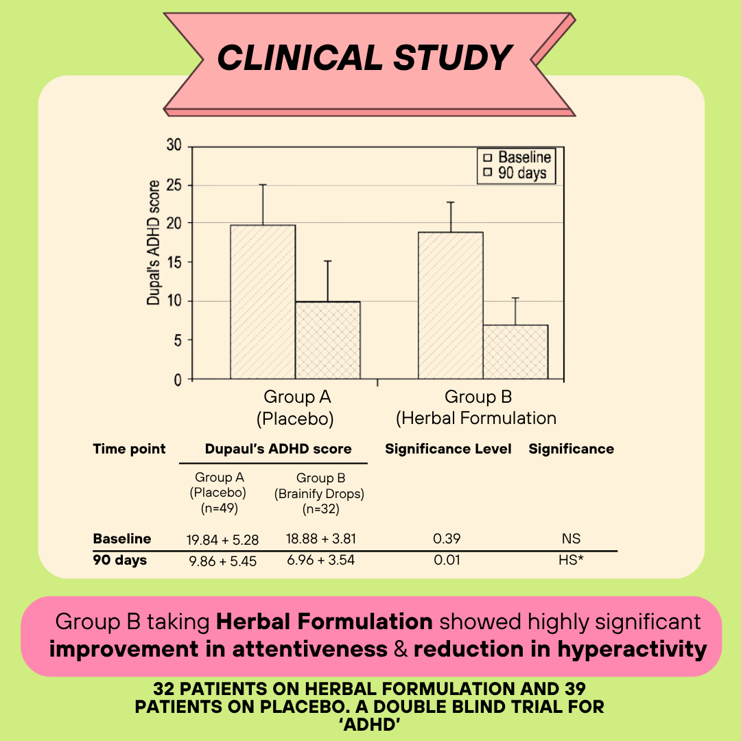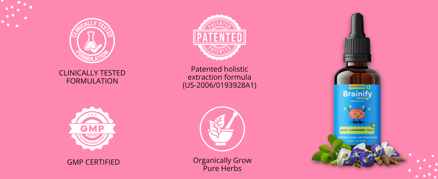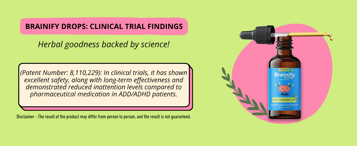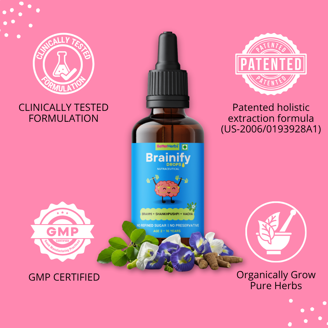 Brainify Drops has herbal formulation that is clinically tested (double-blind trials referenced in product documentation) with reported improvements in attentiveness, reduction in hyperactivity and measurable IQ/memory gains in trial participants.