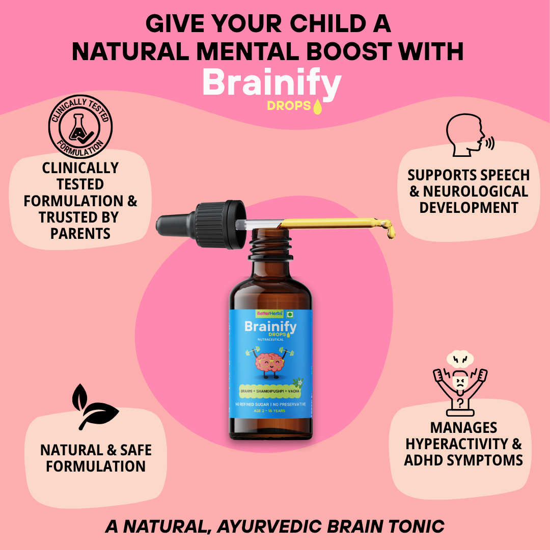 Brainify Drops is a clinically tested formulation, FSSAI-certified Ayurvedic nutraceutical product formulated for children aged 2–16 years to support speech delay, hyperactivity, focus, memory and healthy brain development.