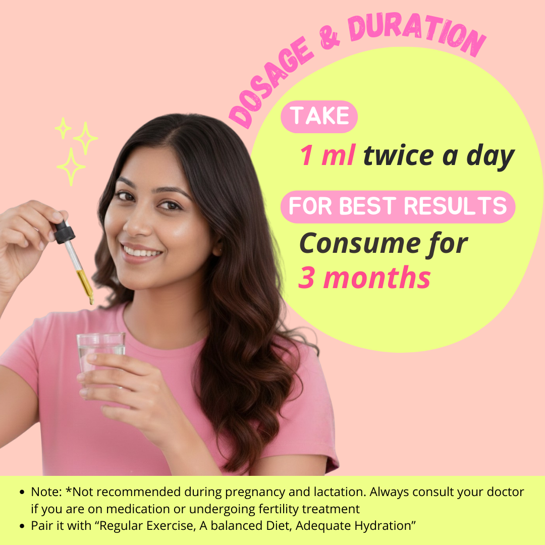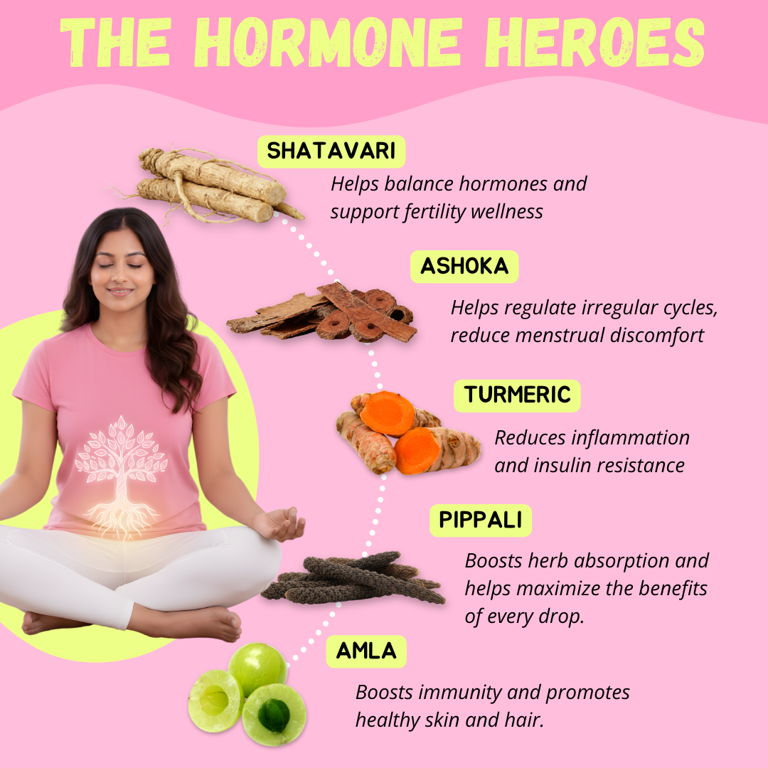 An Ayurvedic dietary supplement in liquid drop form designed to support hormonal wellness in women. It contains 11 herbal extracts traditionally used for reproductive health balance—not a medicine or hormone replacement.